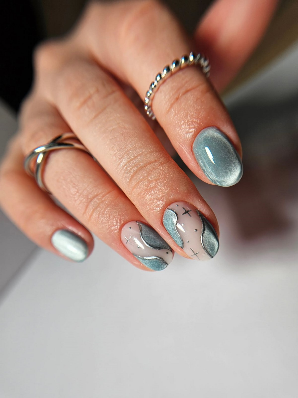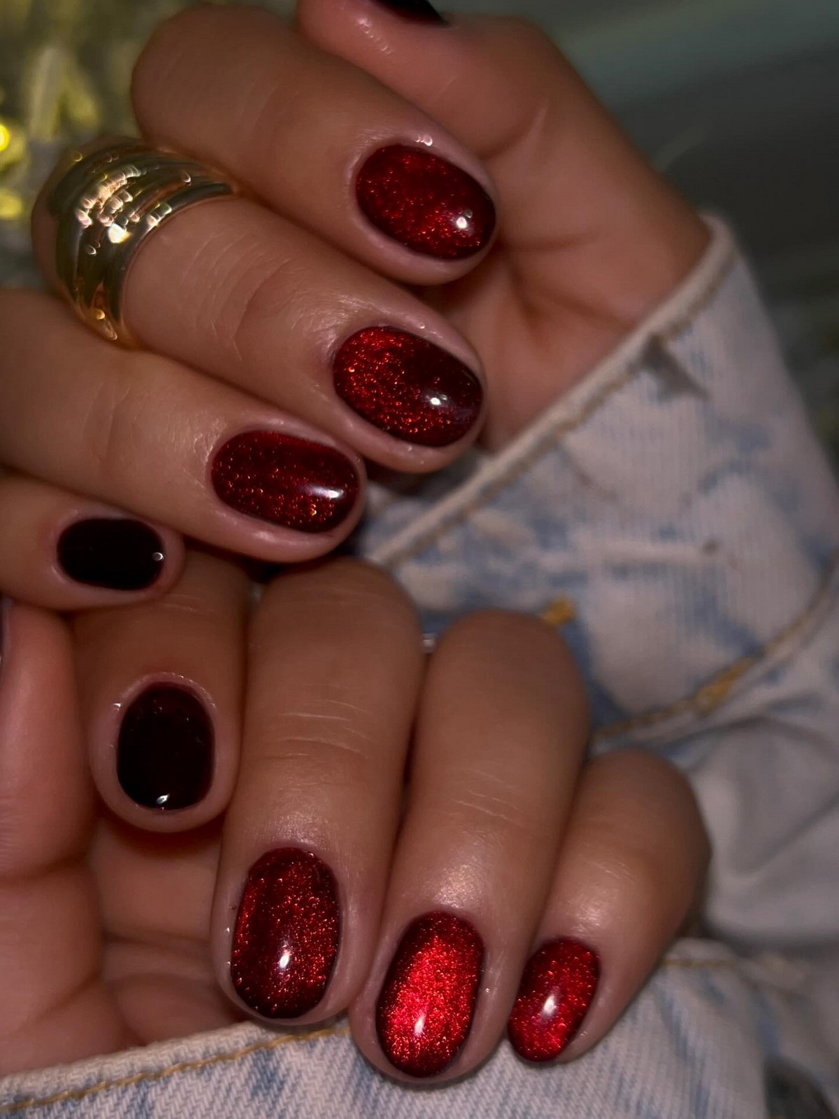 - новогодний маникюр «кошачий глаз» (специальным лаком);