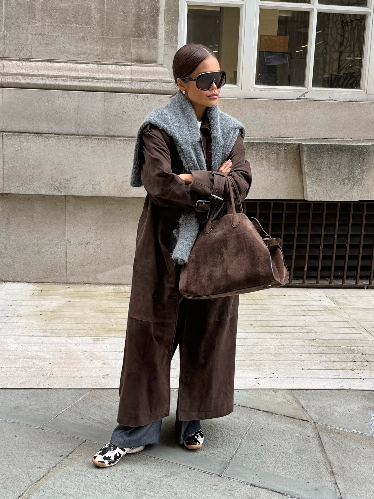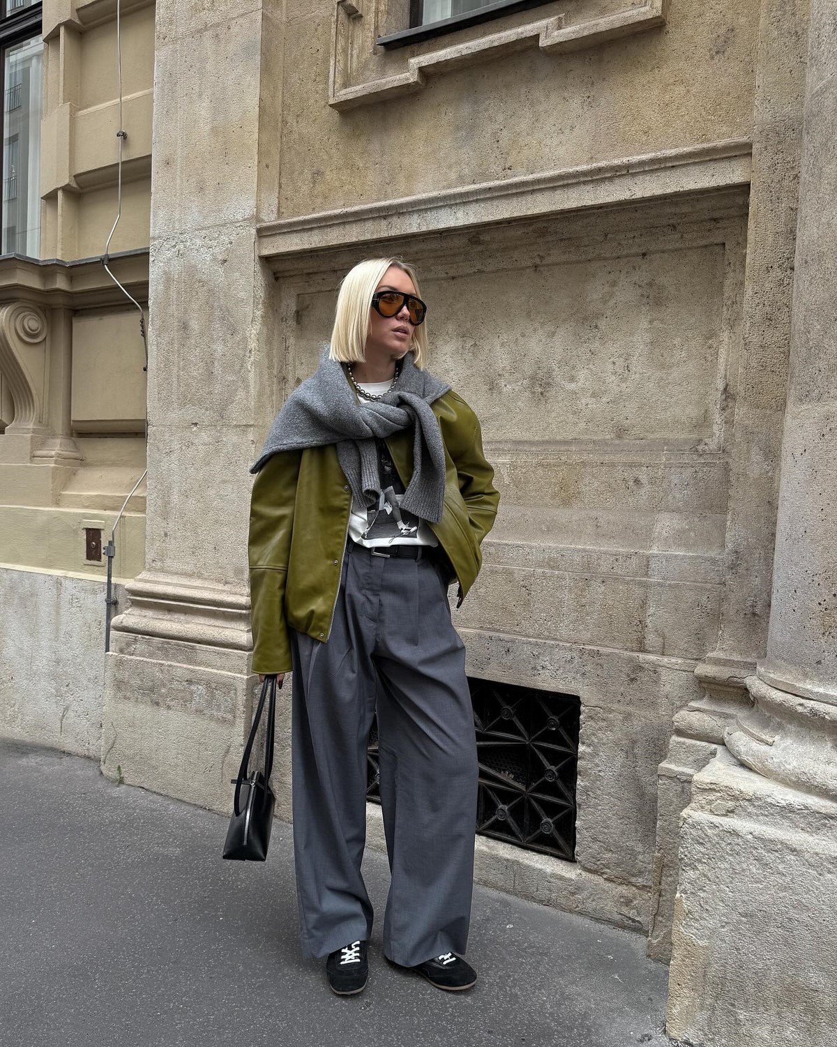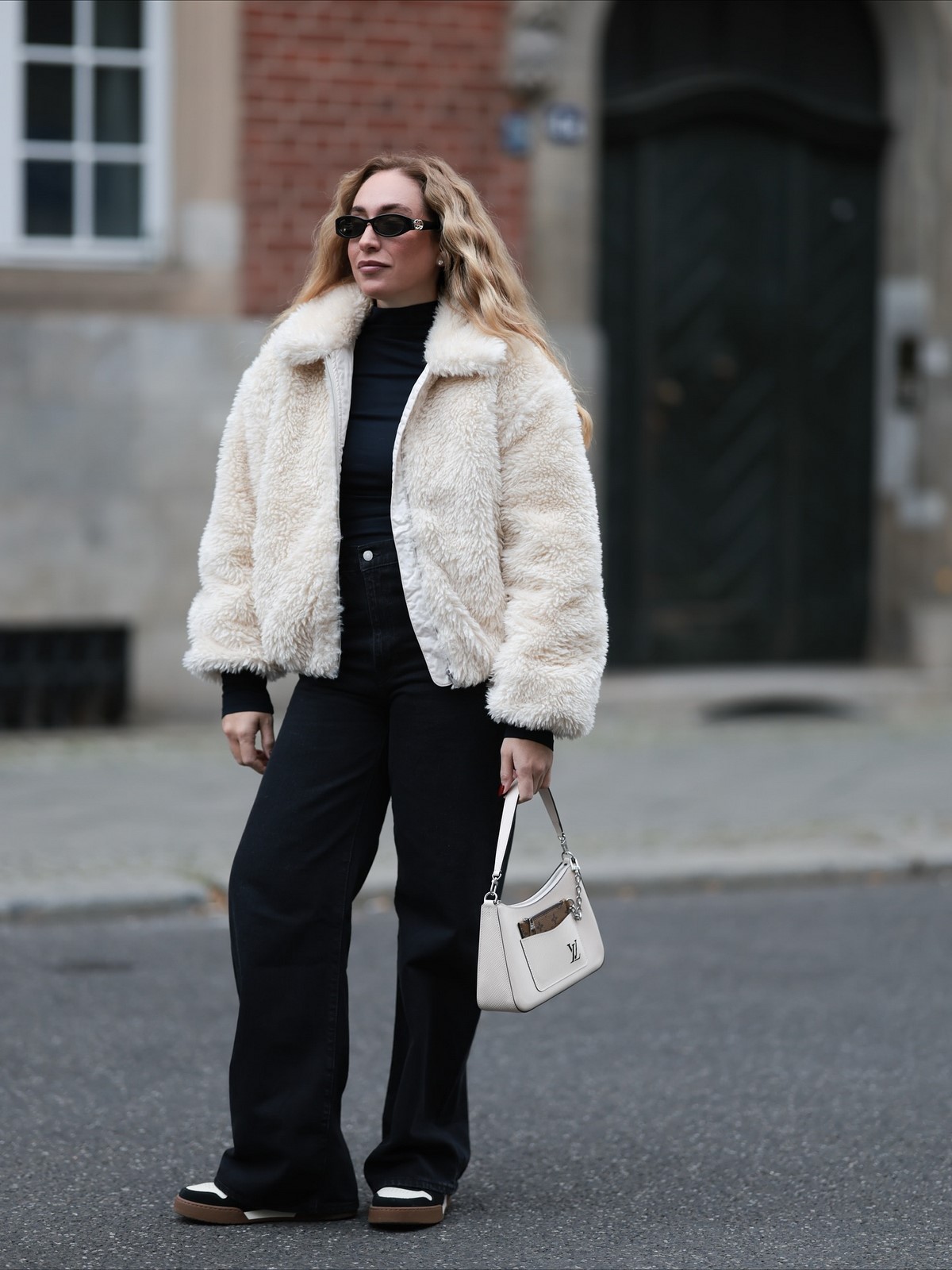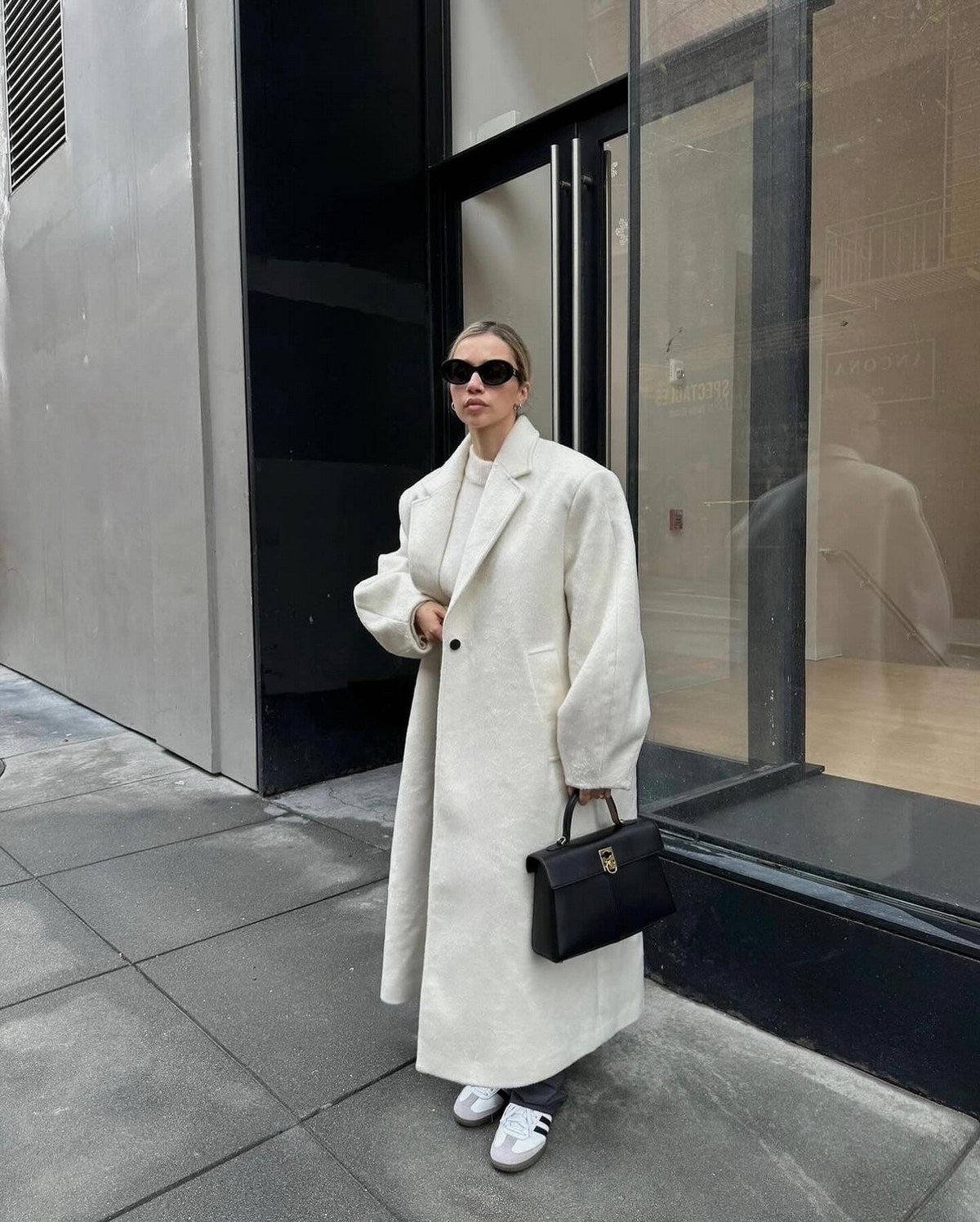 Завершают и делают образ осень-зима более необычным средняя по размеру сумочка на цепочке прямоугольной формы, стильные белые кроссовки, ну и очки… да они осенью и зимой тоже в тренде!