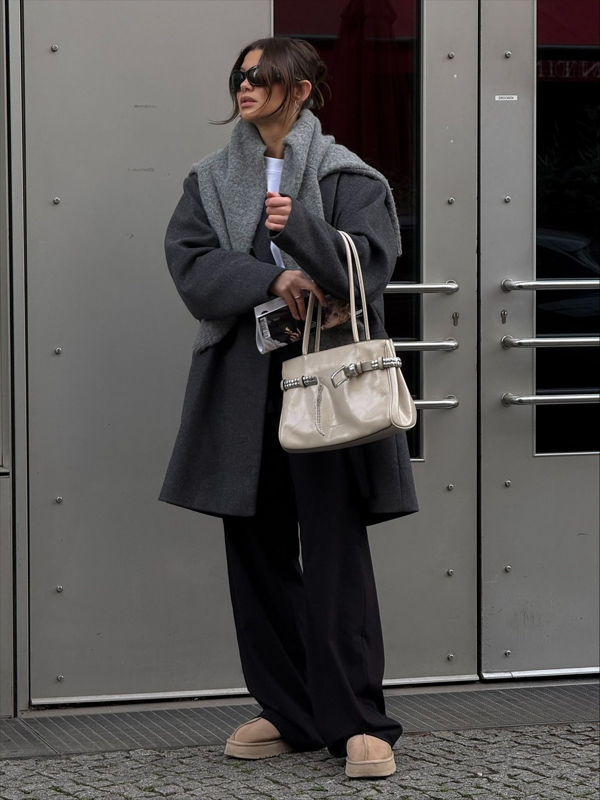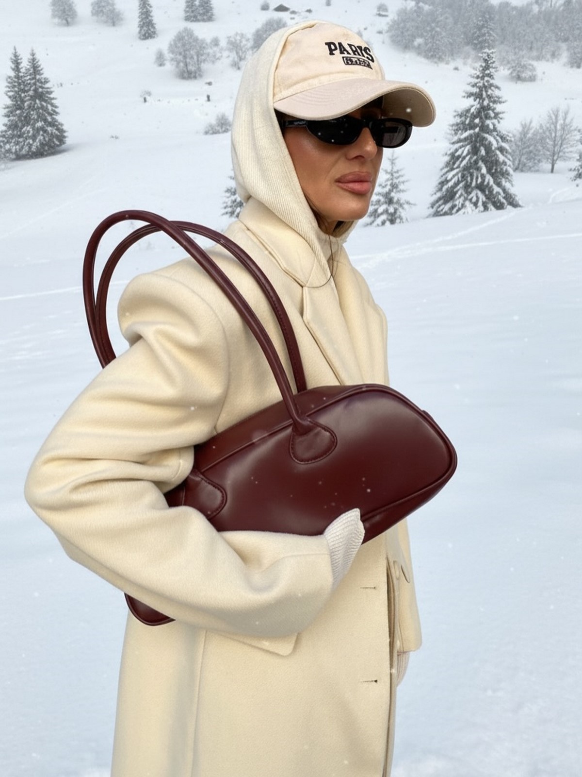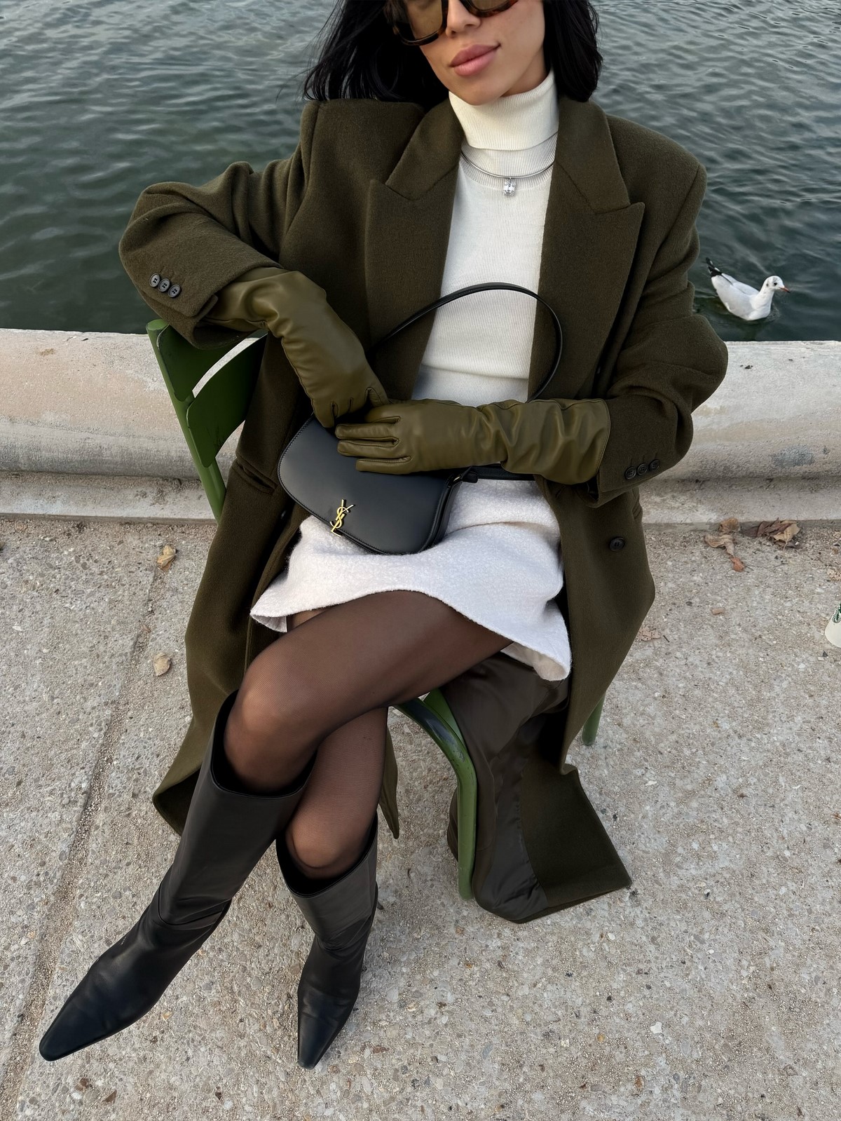 Завершают и делают образ осень-зима более необычным средняя по размеру сумочка на цепочке прямоугольной формы, стильные белые кроссовки, ну и очки… да они осенью и зимой тоже в тренде!