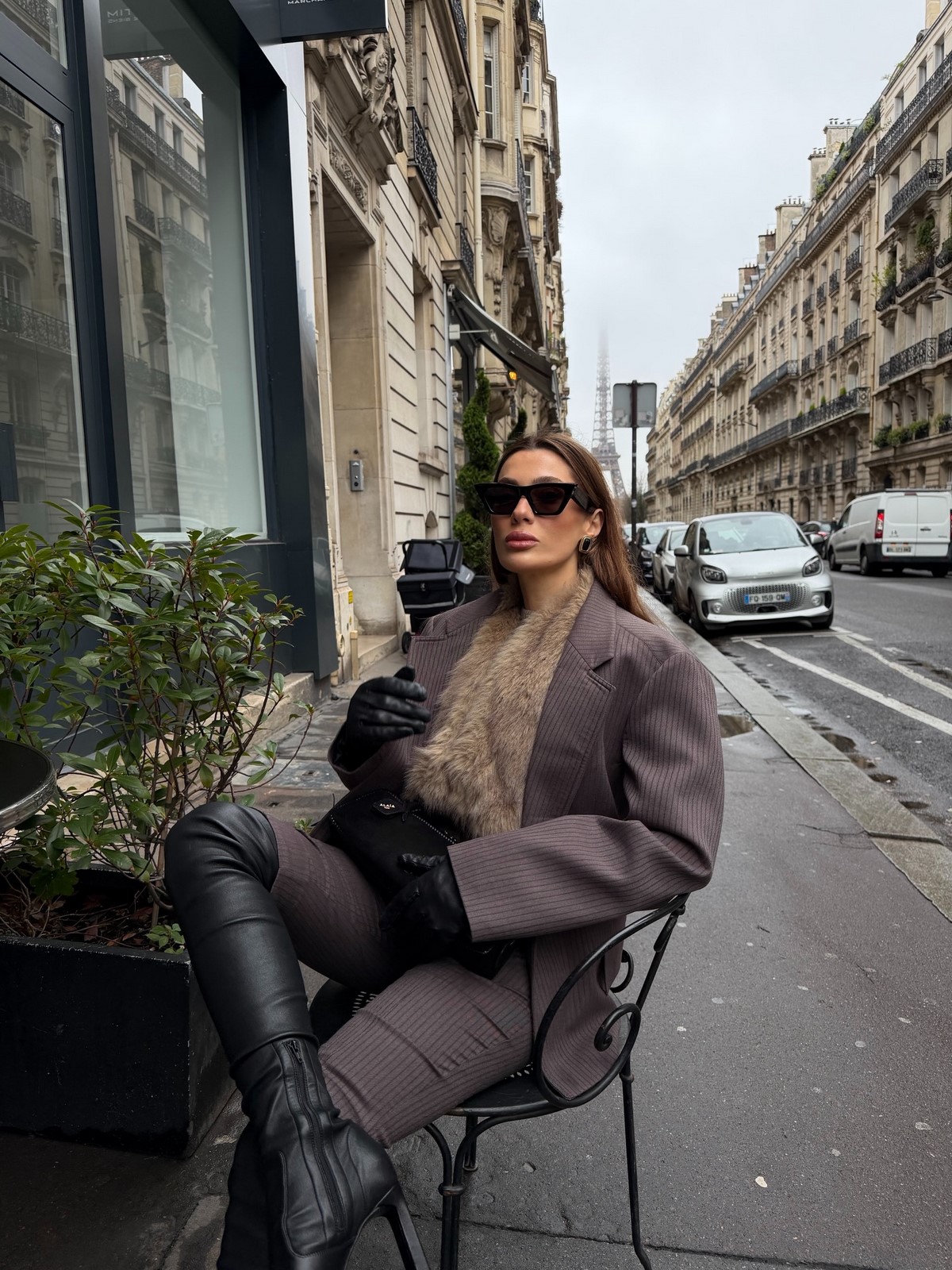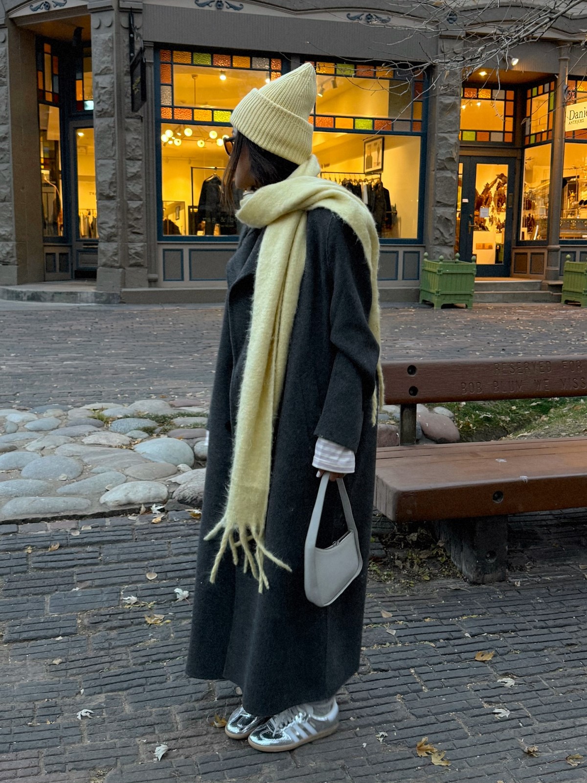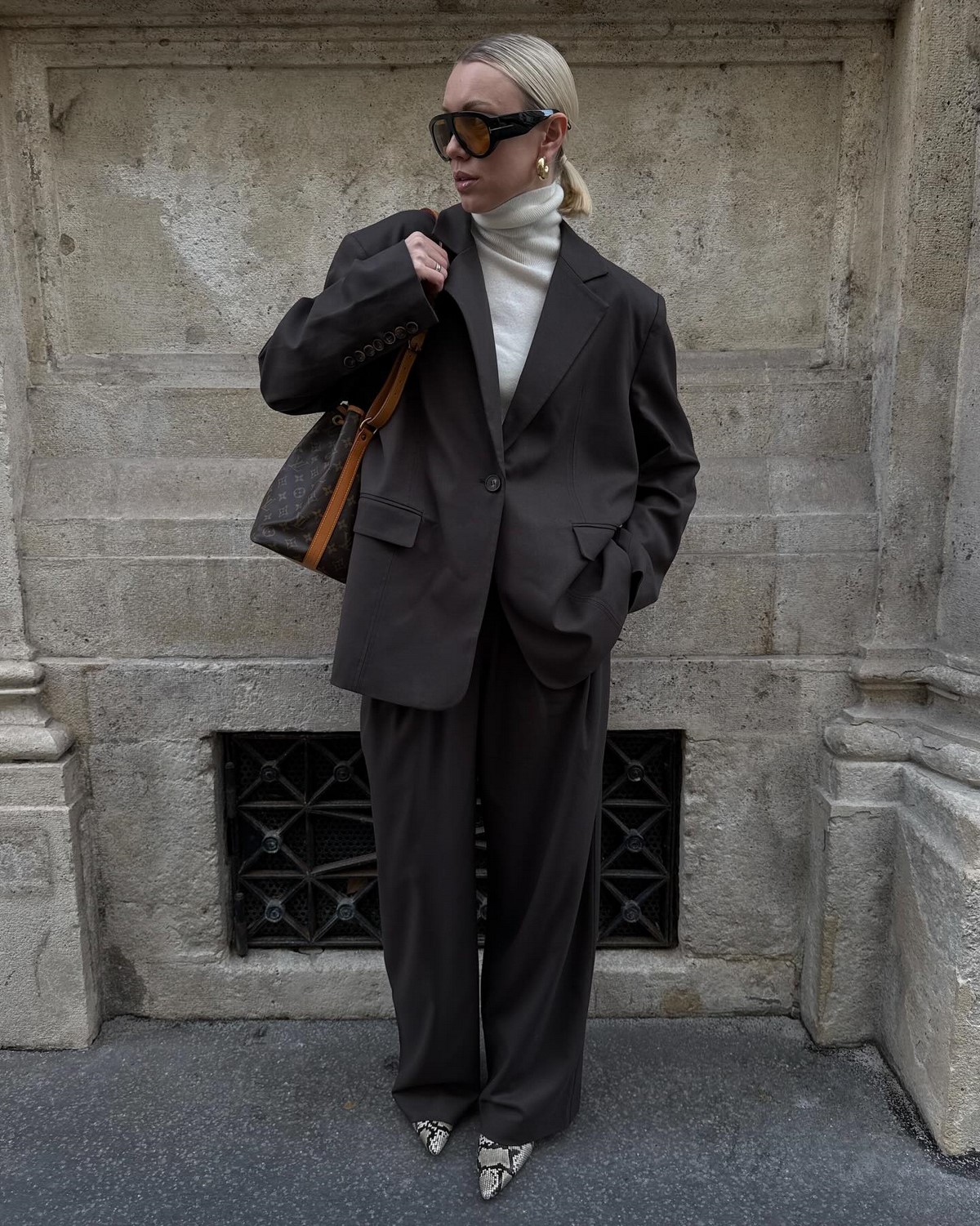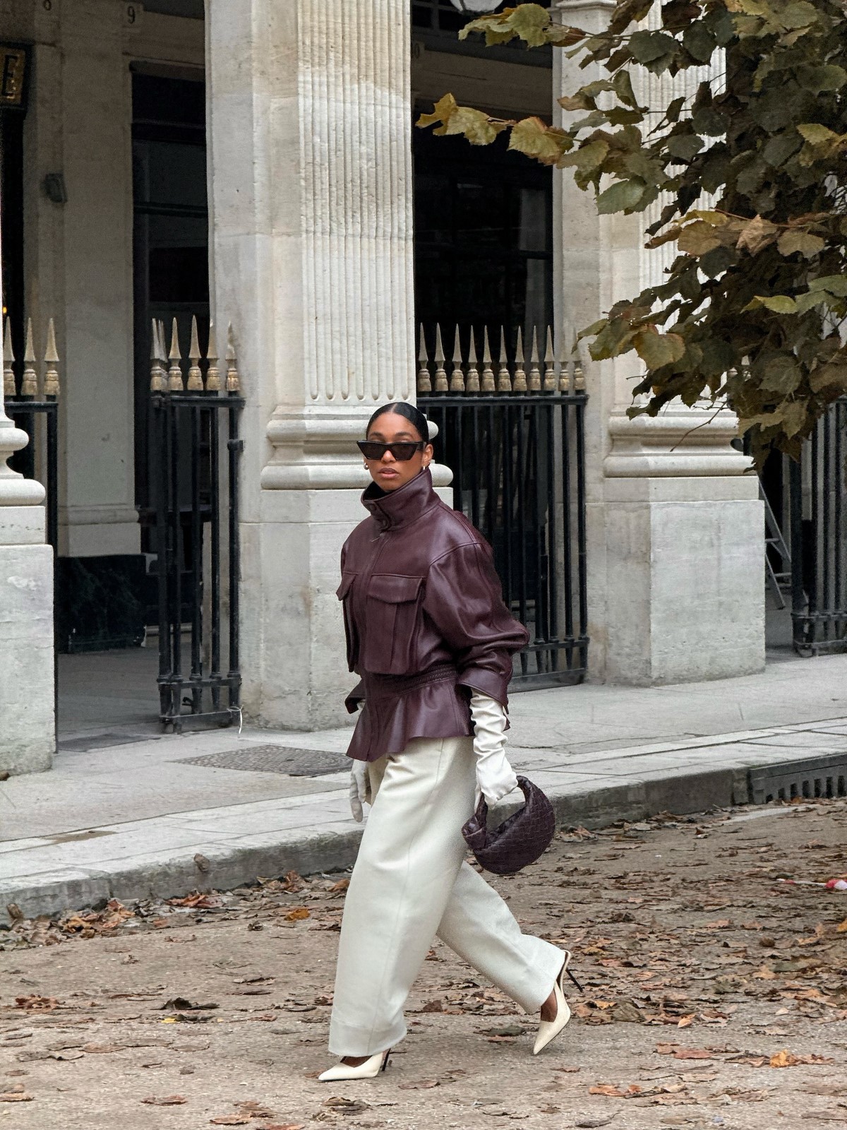 Завершают и делают образ осень-зима более необычным средняя по размеру сумочка на цепочке прямоугольной формы, стильные белые кроссовки, ну и очки… да они осенью и зимой тоже в тренде!