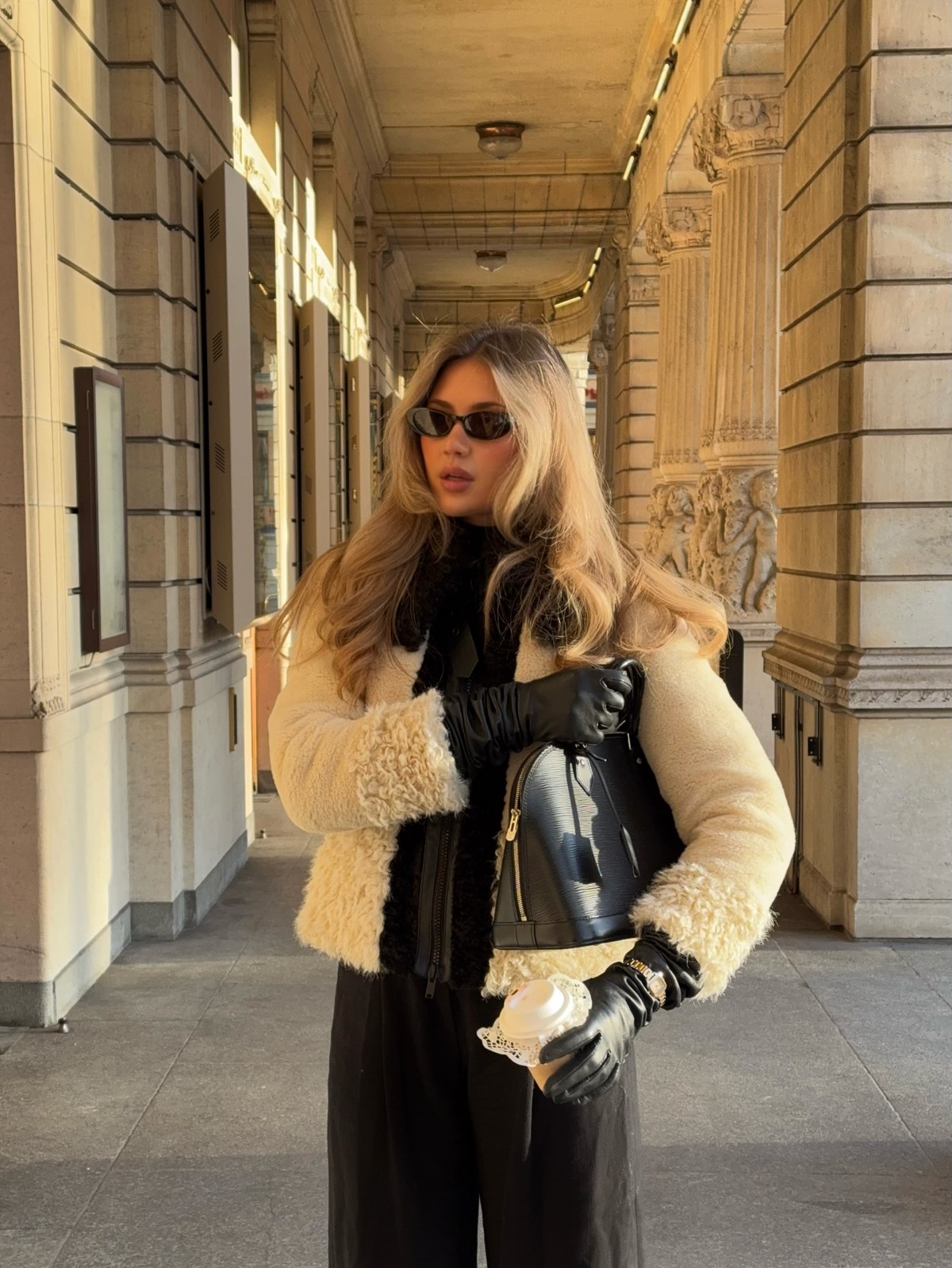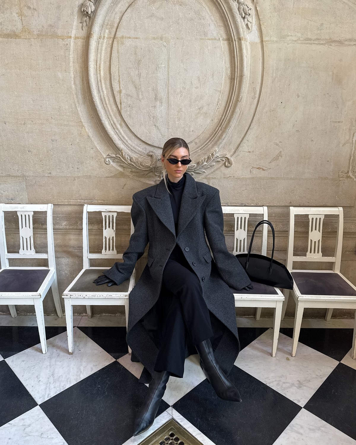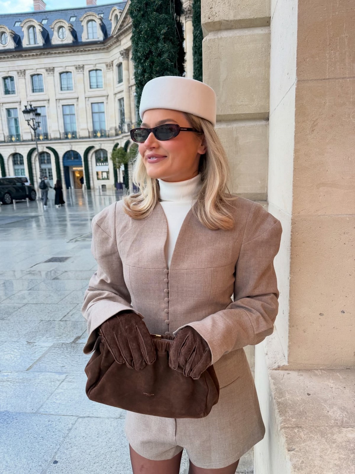 Так как образы осень-зима в этот период немыслимы без верхней одежды, аутфит дополнен освежающим пальто в бежевом цветовом решении с широким воротом и поясом и эффектной шляпой в том же оттенке. Ну и очки, как же без них!