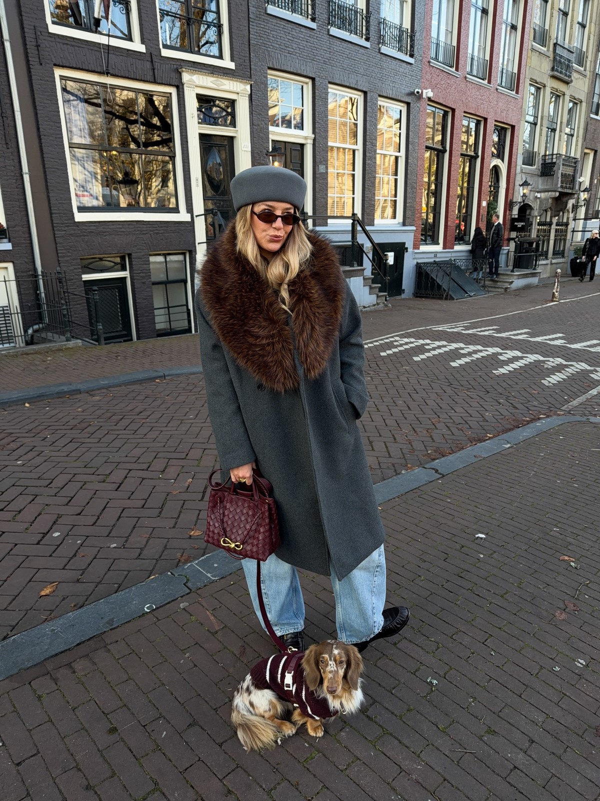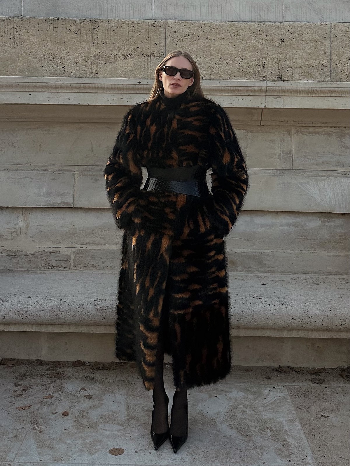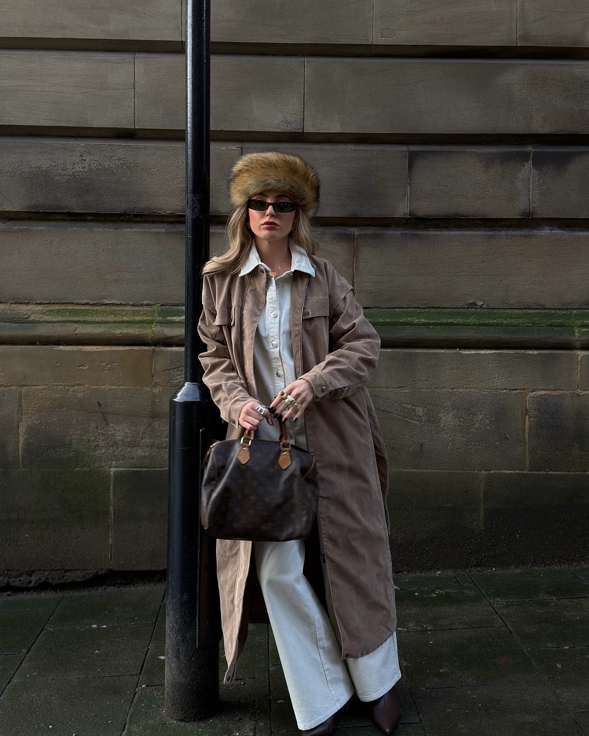 Так как образы осень-зима в этот период немыслимы без верхней одежды, аутфит дополнен освежающим пальто в бежевом цветовом решении с широким воротом и поясом и эффектной шляпой в том же оттенке. Ну и очки, как же без них!