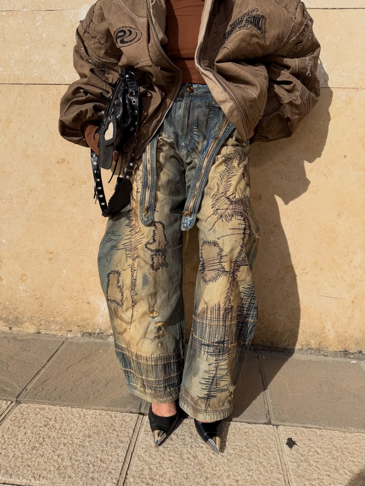 Декорированные. Очень интересны и притягательны модные джинсы осень-зима 2025-2026 декорированные яркой вышивкой, модели с бахромой и джинсы в стиле печворк. Чтобы образ не казался перенасыщенным, такие джинсы носят в однотонным верхом простого кроя.